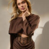 Realizat din atlas fin cu o textură netedă și lucioasă, boleroul se așază frumos pe umeri, oferind confort și un aspect impecabil. Mânecile lungi completează designul elegant, fiind ideal atât pentru evenimente speciale, cât și pentru ținute de zi.