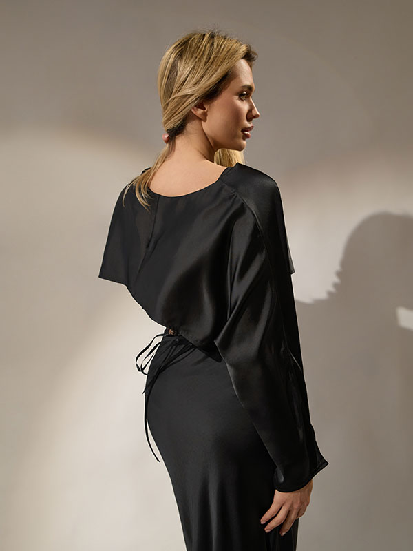 Realizat din atlas fin cu o textură netedă și lucioasă, boleroul se așază frumos pe umeri, oferind confort și un aspect impecabil. Mânecile lungi completează designul elegant, fiind ideal atât pentru evenimente speciale, cât și pentru ținute de zi.
