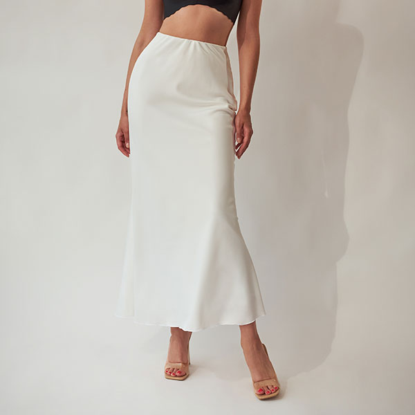Fustă maxi din atlas, croi tip sirenă cu talie înaltă și elastic la bată.