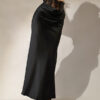 Fusta maxi tip sirenă, confecționată din atlas de înaltă calitate, fusta cade ușor în față, formând pliuuri delicate, iar croiala tip sirenă urmează armonios linia corpului, evidențiind silueta, în talie cu corset din dantelă franceză neagră, perfectă pentru cei care apreciază eleganța clasică și detaliile rafinate. Corsetul integrat, cu design minimalist și elegant, completează ținuta cu un aer rafinat. Ideală pentru evenimente speciale, cine elegante sau apariții remarcabile, această fustă oferă un look feminin și sofisticat.