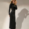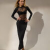 Rochie lungă, realizată din tricot elastic fin, cu o croială care urmează linia corpului, punând în valoare silueta. Partea frontală, până în talie, este decorată cu dantelă transparentă, cu un model floral delicat, ce adaugă un contrast senzual și rafinat. Fiind o zonă semi-transparentă, se recomandă purtarea cu braletă, sutien sau top separat (acestea nu sunt incluse).