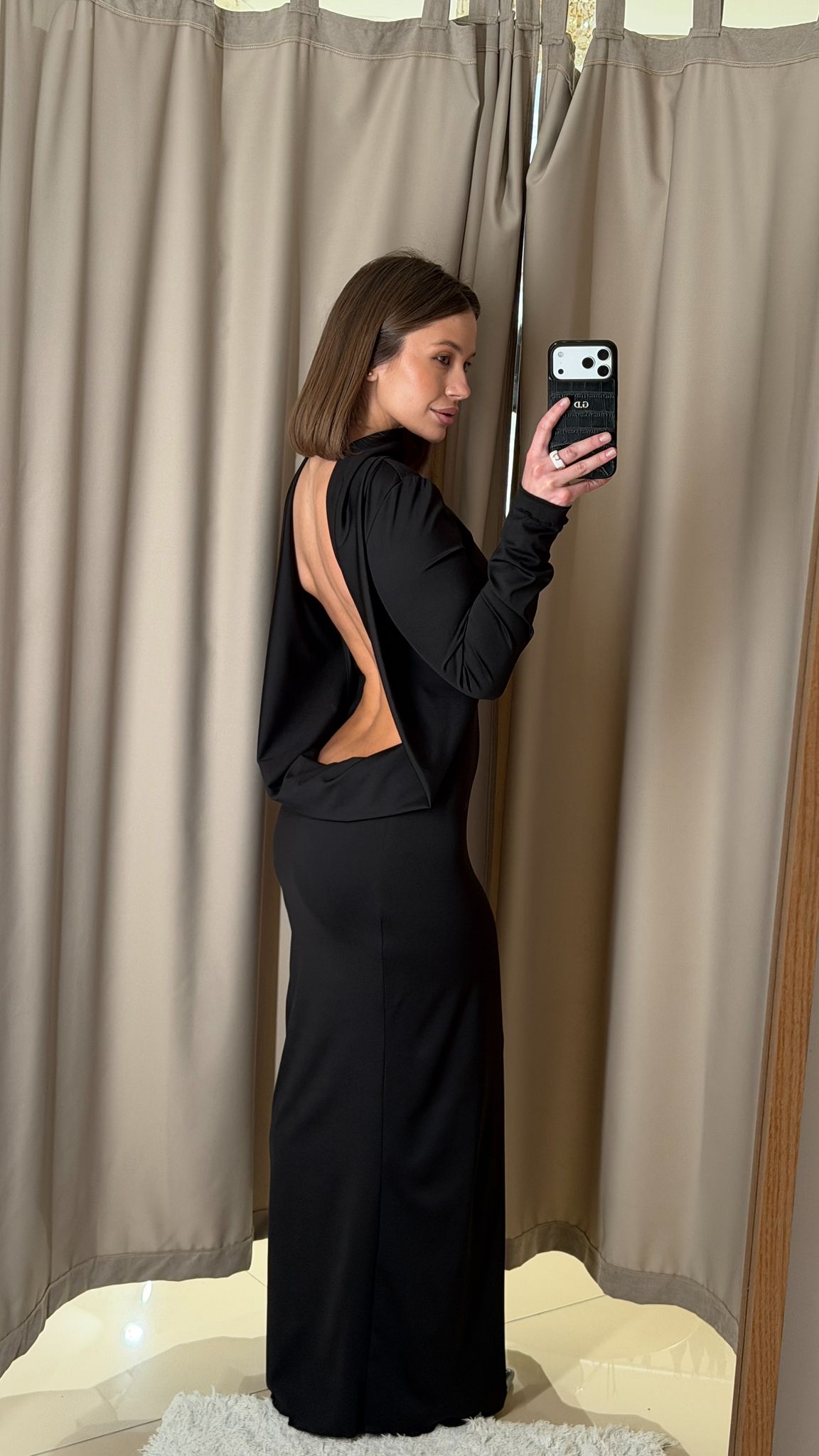 Decolteul profund creează un punct focal puternic, iar construcția piesei echilibrează senzualitatea cu o linie elegantă și coerentă. Mânecile lungi și lungimea maxi oferă contrast și stabilitate vizuală siluetei.